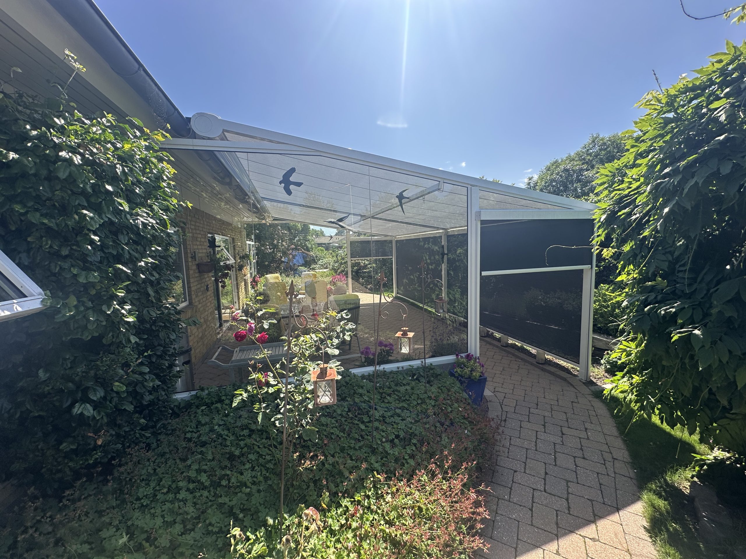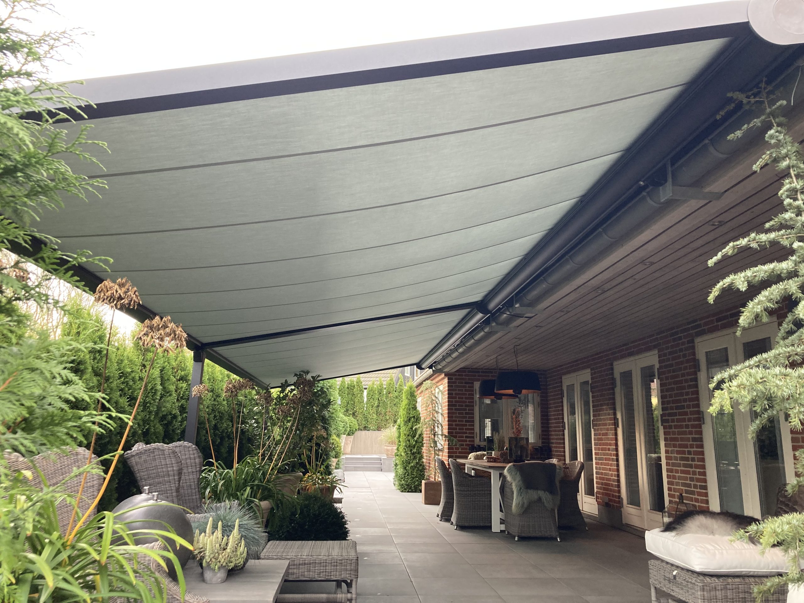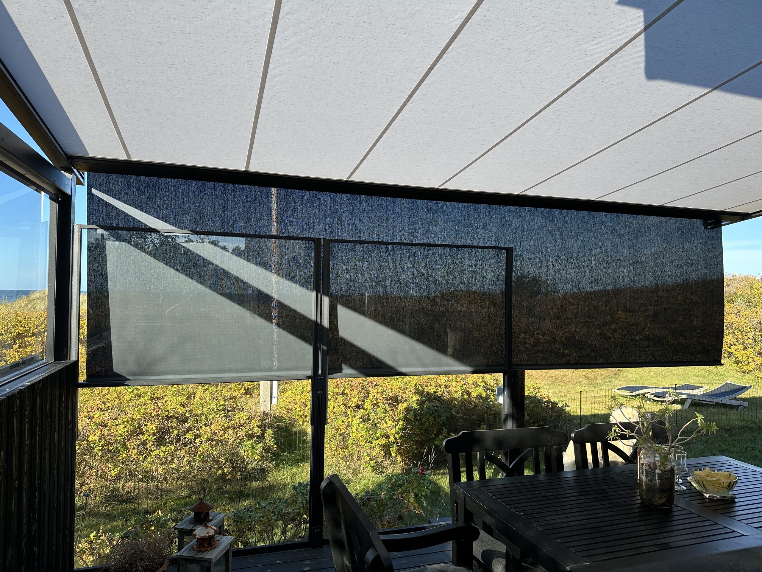 Pergolaer fremstilles efter individuelle mål, så de passer optimalt til dine udendørsarealer. Du kan vælge mellem forskellige dugtyper, farver og styringsløsninger – blandt andet fjernbetjening eller app-styring via SOMFY.
