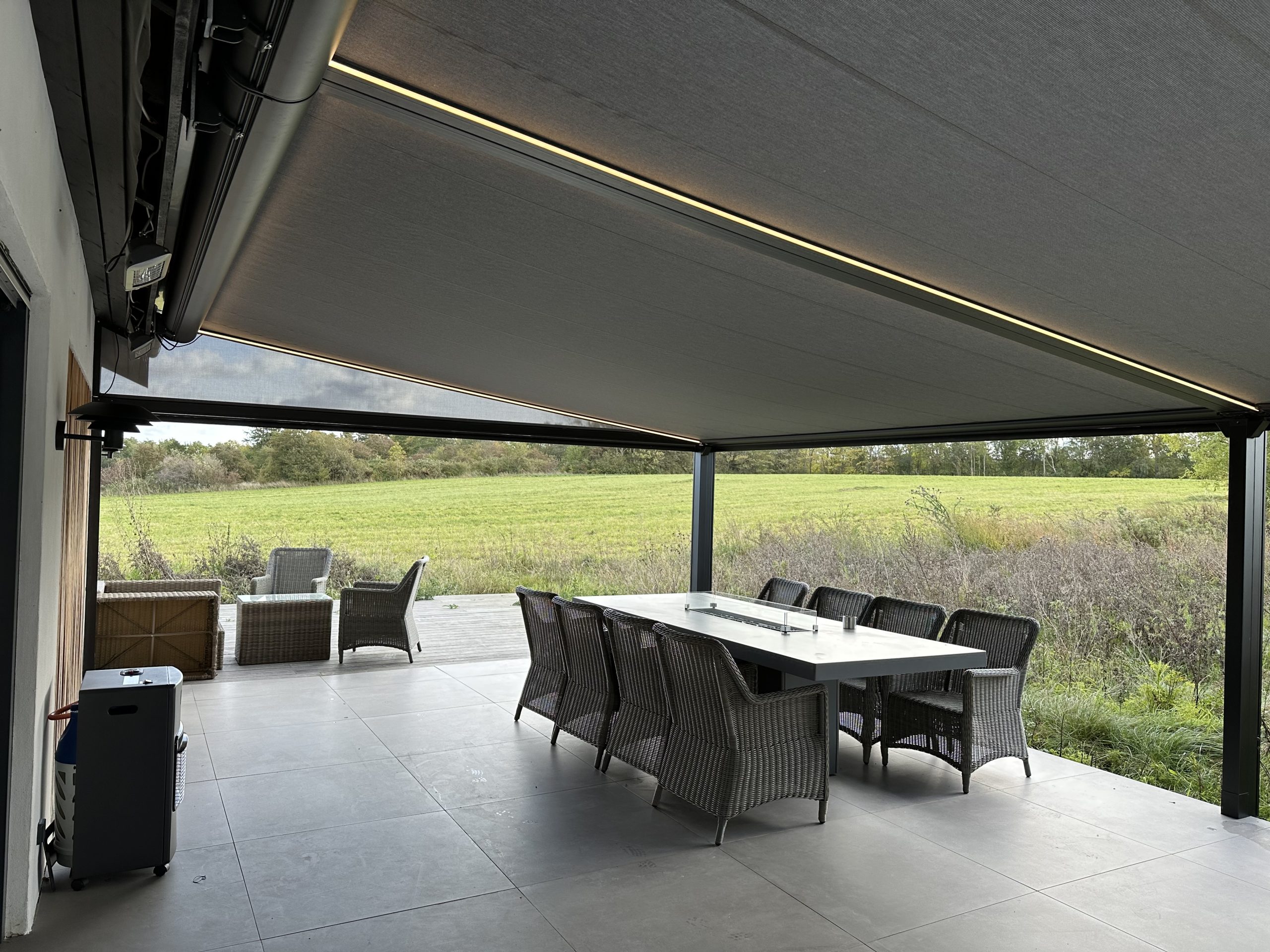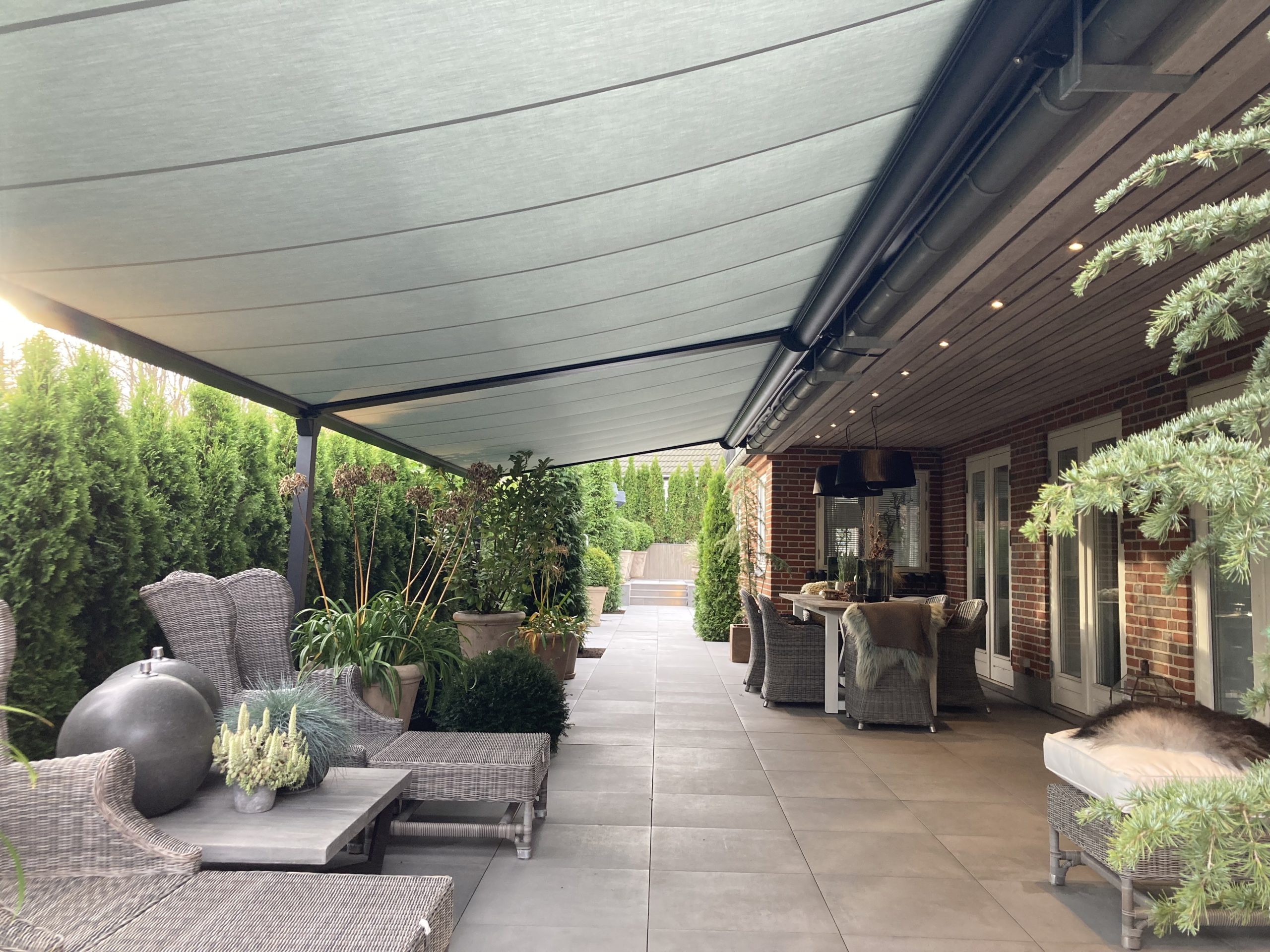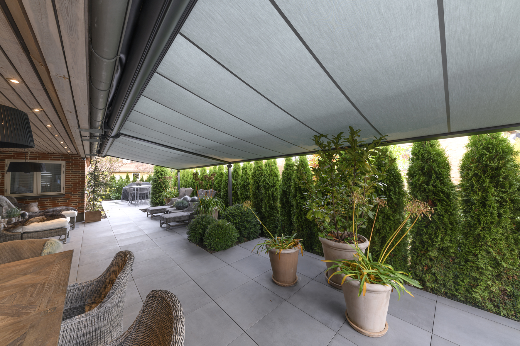 Pergolaer fremstilles efter individuelle mål, så de passer optimalt til dine udendørsarealer. Du kan vælge mellem forskellige dugtyper, farver og styringsløsninger – blandt andet fjernbetjening eller app-styring via SOMFY.